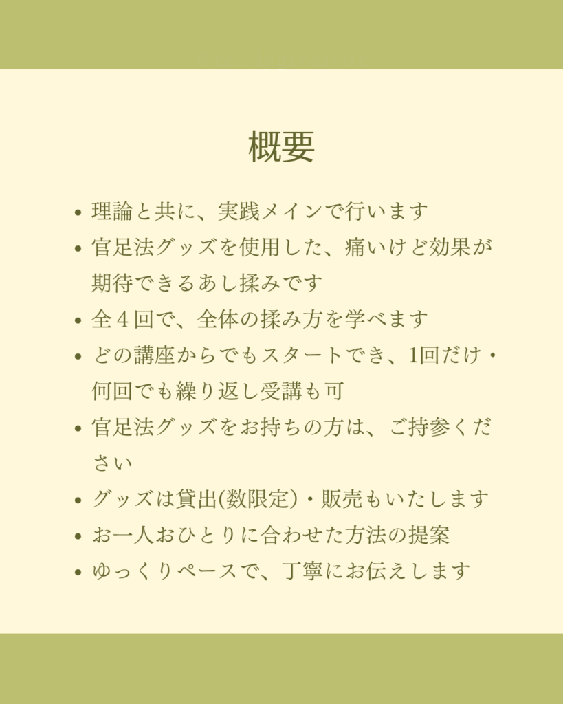 足先から太ももまで、部位ごとに効果的で、なるべく体に負担なく楽な揉み方を官足法のグッズを使ってお伝えしていきます。